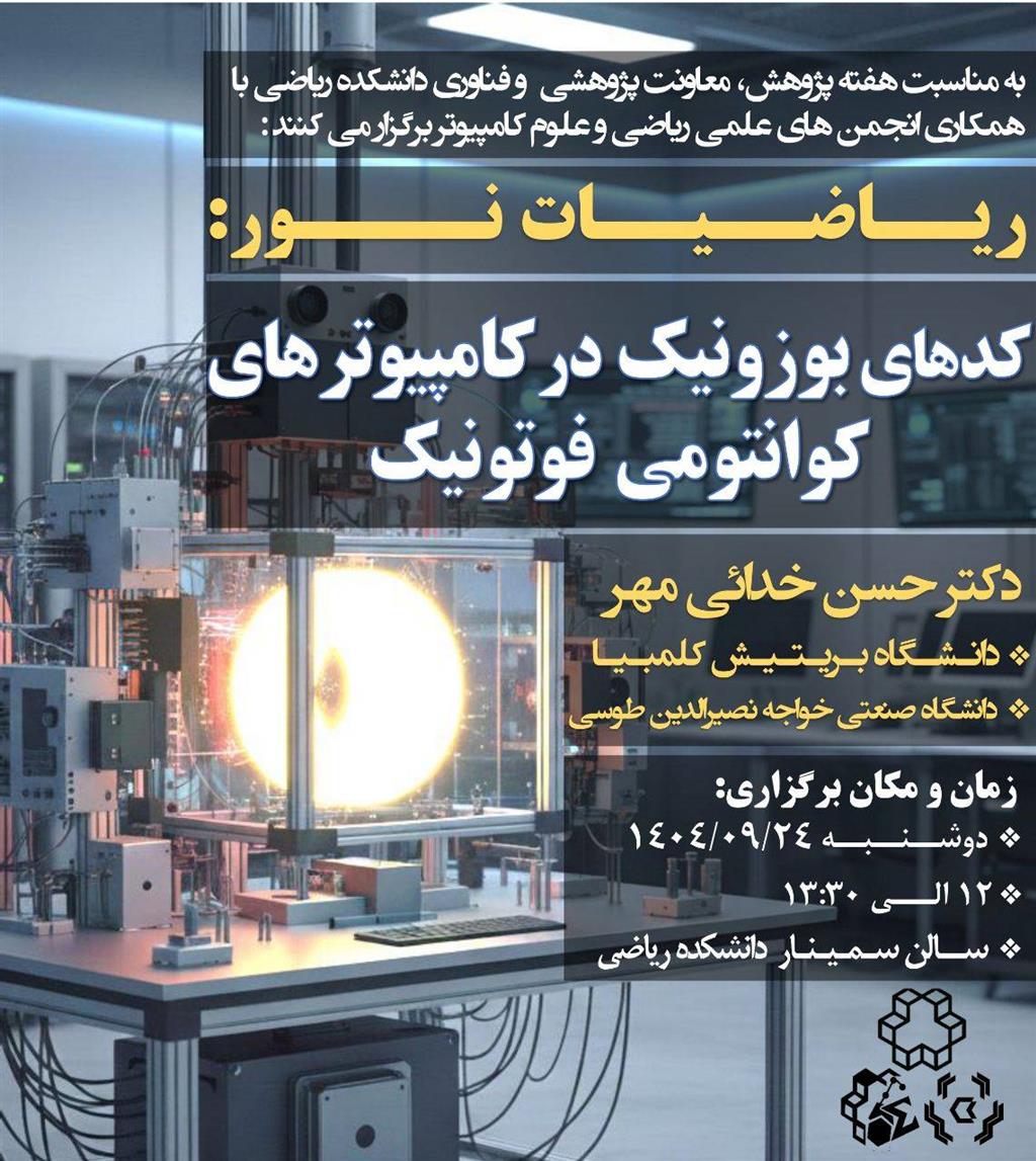 🔹معاونت پژوهشی دانشکده ریاضی دانشگاه صنعتی خواجه نصیرالدین طوسی با همکاری انجمنهای علمی علوم کامپیوتر و ریاضی، به مناسبت هفته پژوهش برگزار میکند: