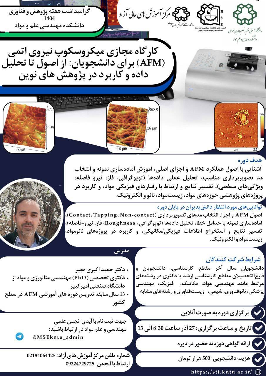 🔹 کارگاه مجازی میکروسکوپ نیروی اتمی (AFM) برای دانشجویان: از اصول تا تحلیل داده و کاربرد در پژوهشهای نوین