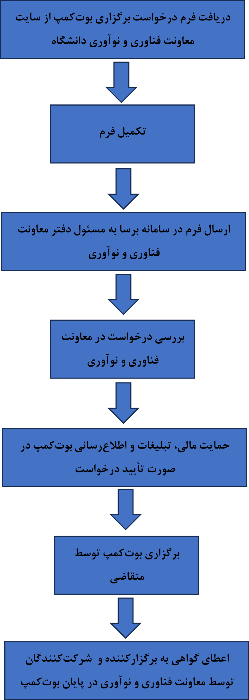 از اعضای محترم هیئت علمی و انجمنهای علمی که مایل به برگزاری بوتکمپهای تخصصی در دانشگاه هستند، تقاضا میشود فرم درخواست برگزاری بوتکمپ را تکمیل و از طریق سامانه برسا برای مسئول دفتر معاونت فناوری و نوآوری ارسال نمایند. درخواستها در معاونت فناوری و نوآوری دانشگاه مورد بررسی قرار گرفته و به درخواستهای واجد شرایط، بودجه تخصیص داده میشود. از طرف معاونت فناوری و نوآوری به برگزارکنندگان بوتکمپ و شرکتکنندگان در بوتکمپ گواهی اعطا میشود. برای کسب اطلاعات بیشتر، با کارشناس اداره کارآفرینی و نوآوری با شماره 84064265 تماس حاصل فرمایید.