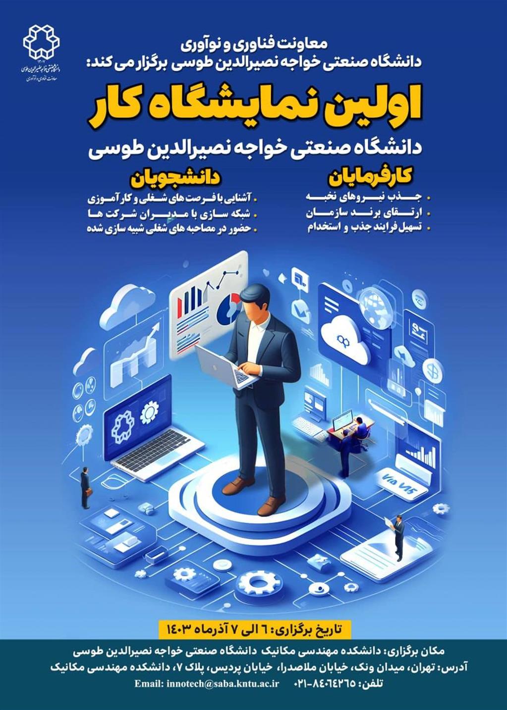 معاونت فناوری و نوآوری دانشگاه در راستای تقویت تعامل بین صنعت و دانشگاه و بسترسازی برای اشتغال دانشجویان و دانشآموختگان «نمایشگاه کار و هدایت شغلی» را به صورت پیوسته برگزار مینماید. نمایشگاه کار رویدادی است که در آن، شرکتها فرصتهای کارآموزی و شغلی موجود را به کارجویان متقاضی استخدام معرفی و از آنها رزومه دریافت میکنند. حضور در نمایشگاه کار فرصت مناسبی برای شرکتها در راستای تبلیغ و ارتقای برند کارفرمایی، شبکهسازی با سایر شرکتهای حاضر در نمایشگاه و جذب و استخدام نیروی کار نخبه، با انگیزه و خلاق است. کارجویان نیز با حضور در نمایشگاه کار، با واقعیتهای صنعت و شغلهای مختلف آشنا میشوند، اطلاعاتی در مورد نحوه ارائه درخواست کار و شرکت در مصاحبه کسب میکنند و مهارتهای جمعآوری اطلاعات شغلی و شبکهسازی خود را تقویت مینمایند.